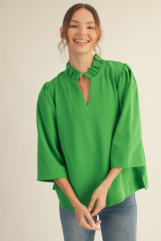 Ruffled Neck 3/4 Sleeve Top, Green