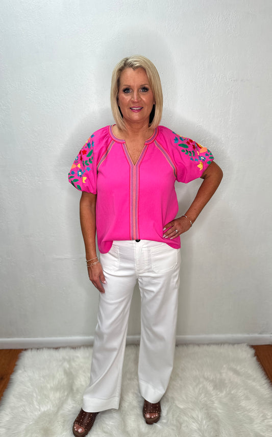 Embroidery Puff Sleeves Top, Pink