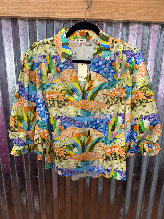 Blue Mix Collared V Neck Top