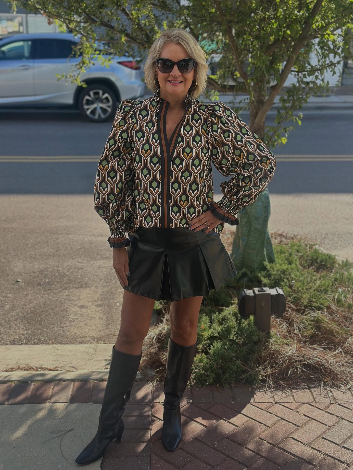 Geometric print long sleeve top featuring contrast trim split neck, smocked mock neck, and smocked cuffs. Unlined. Woven. Non-sheer. Lightweight.