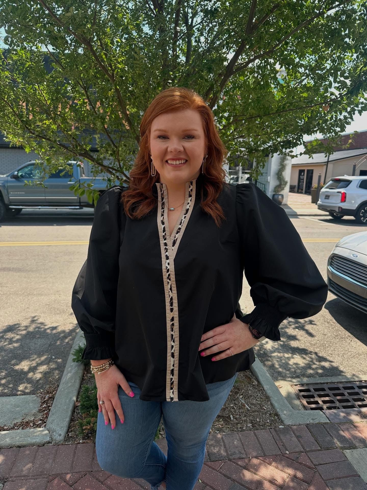 Solid long sleeve top featuring animal printed contrast at front placket and neckline. Smocked cuffs. Ruffled mock neck. Unlined. Non-sheer. Woven. Lightweight.