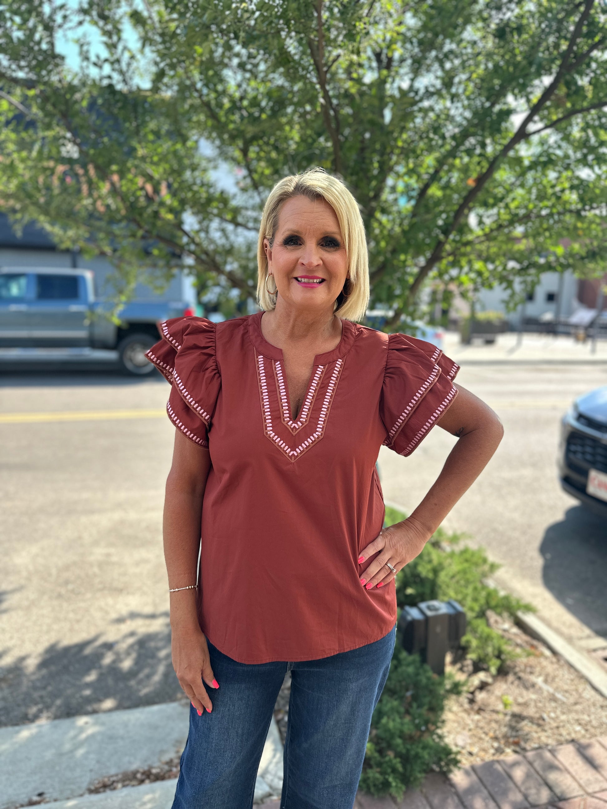 Solid layered ruffle flutter sleeve top featuring contrast embroidered trim V-neck. Unlined. Woven. Non-sheer. Lightweight.