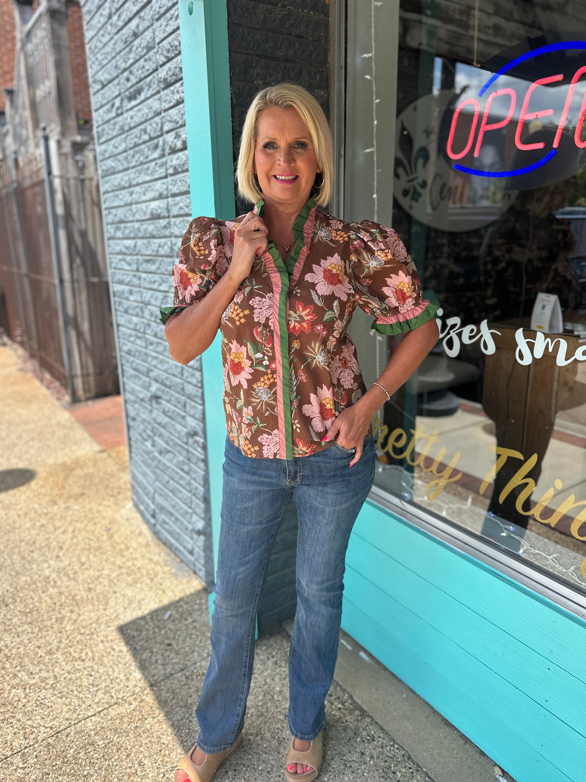 Floral print shoulder puff sleeve top featuring mulitcolor accent ruffle band detail