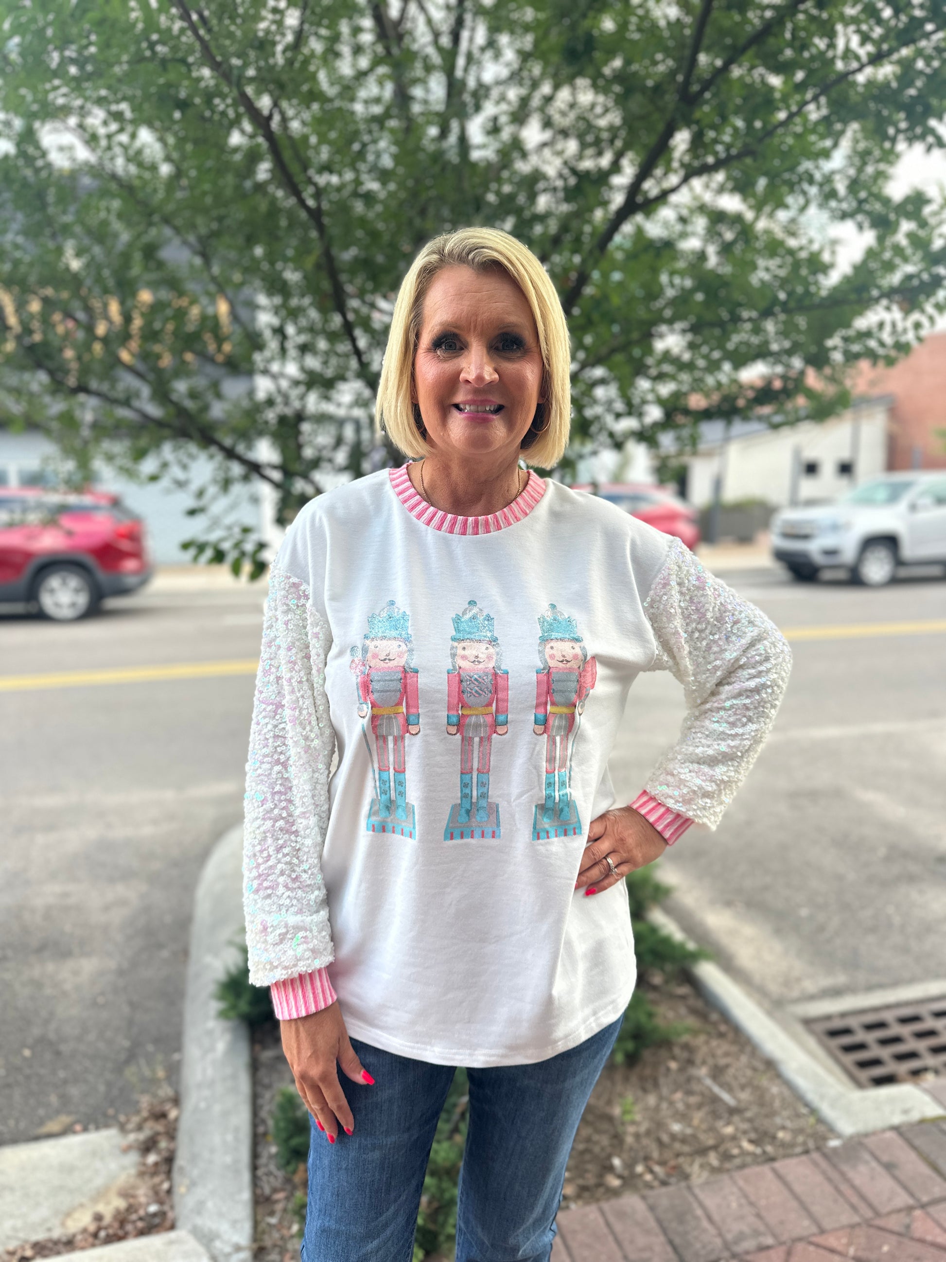 Glitter Nutcrackers on White Top with Iridescent Sequin Sleeves