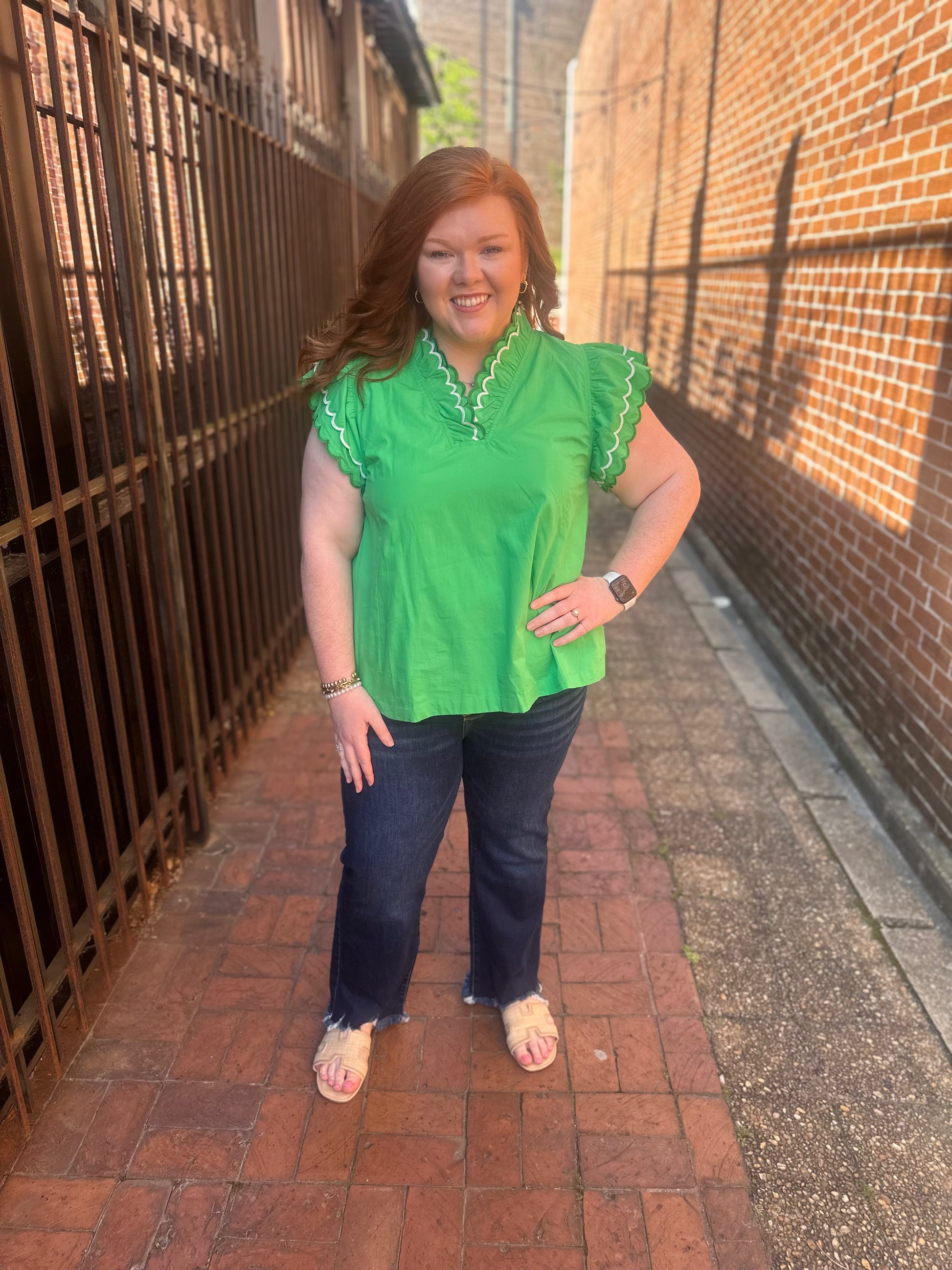 Kelly Green Scallop Trim Ruffle Sleeve Top