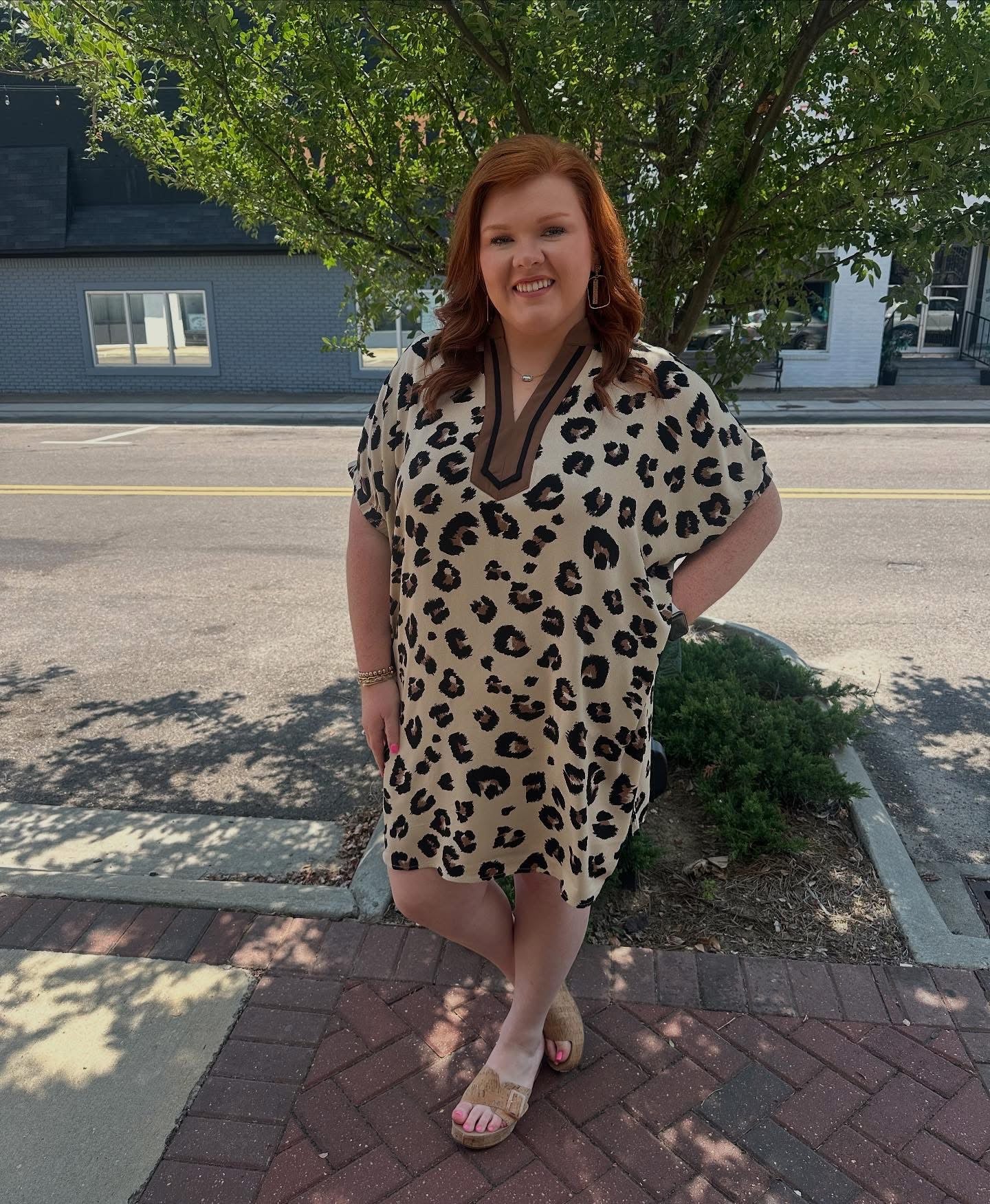 Oversized leopard pattern elasticated dolman sleeve mini dress featuring contrast inset binding neck band collar. Lined. Woven. Non-sheer. Lightweight.