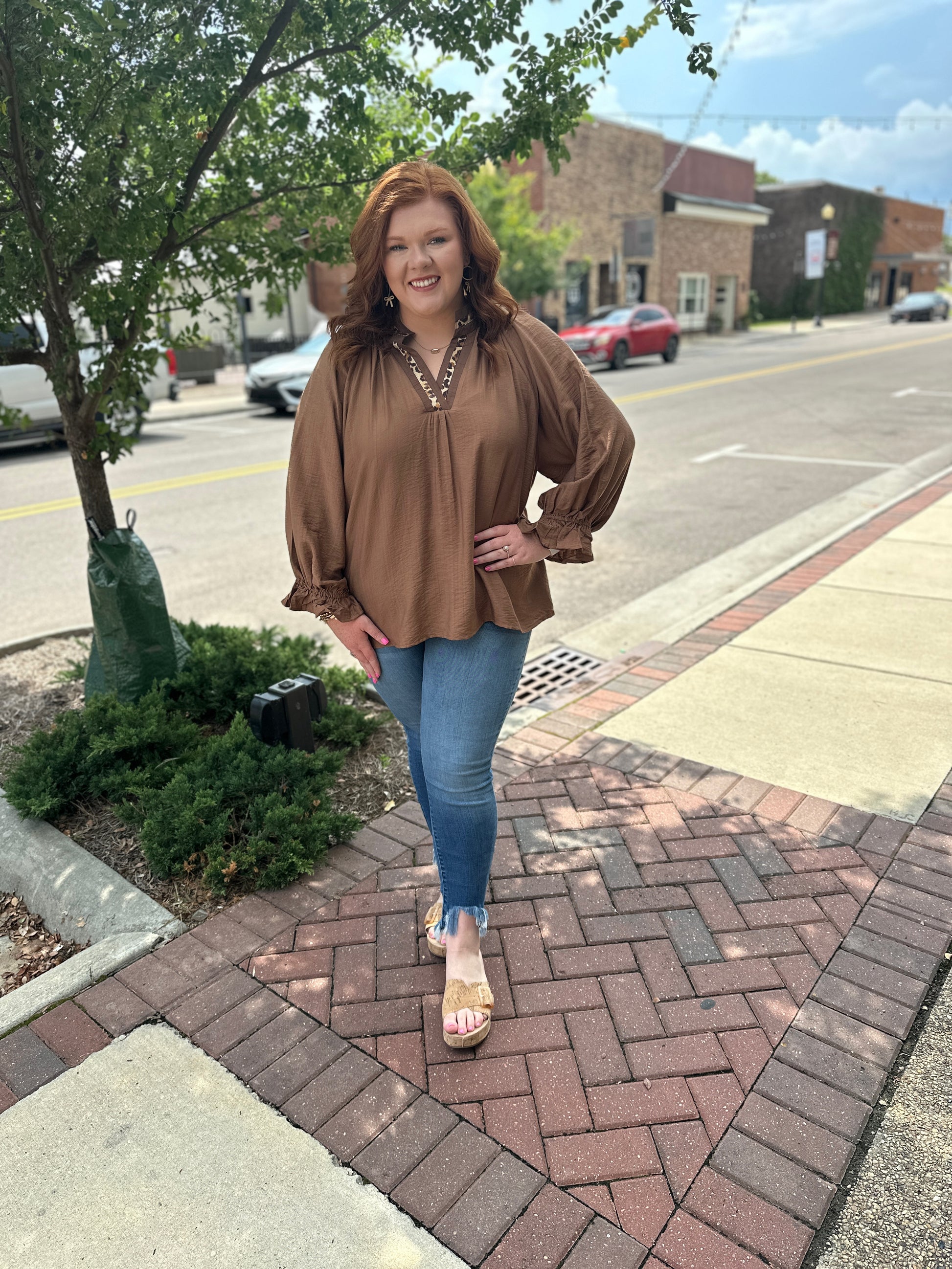 +Leopard Trim V-Neck Blouse