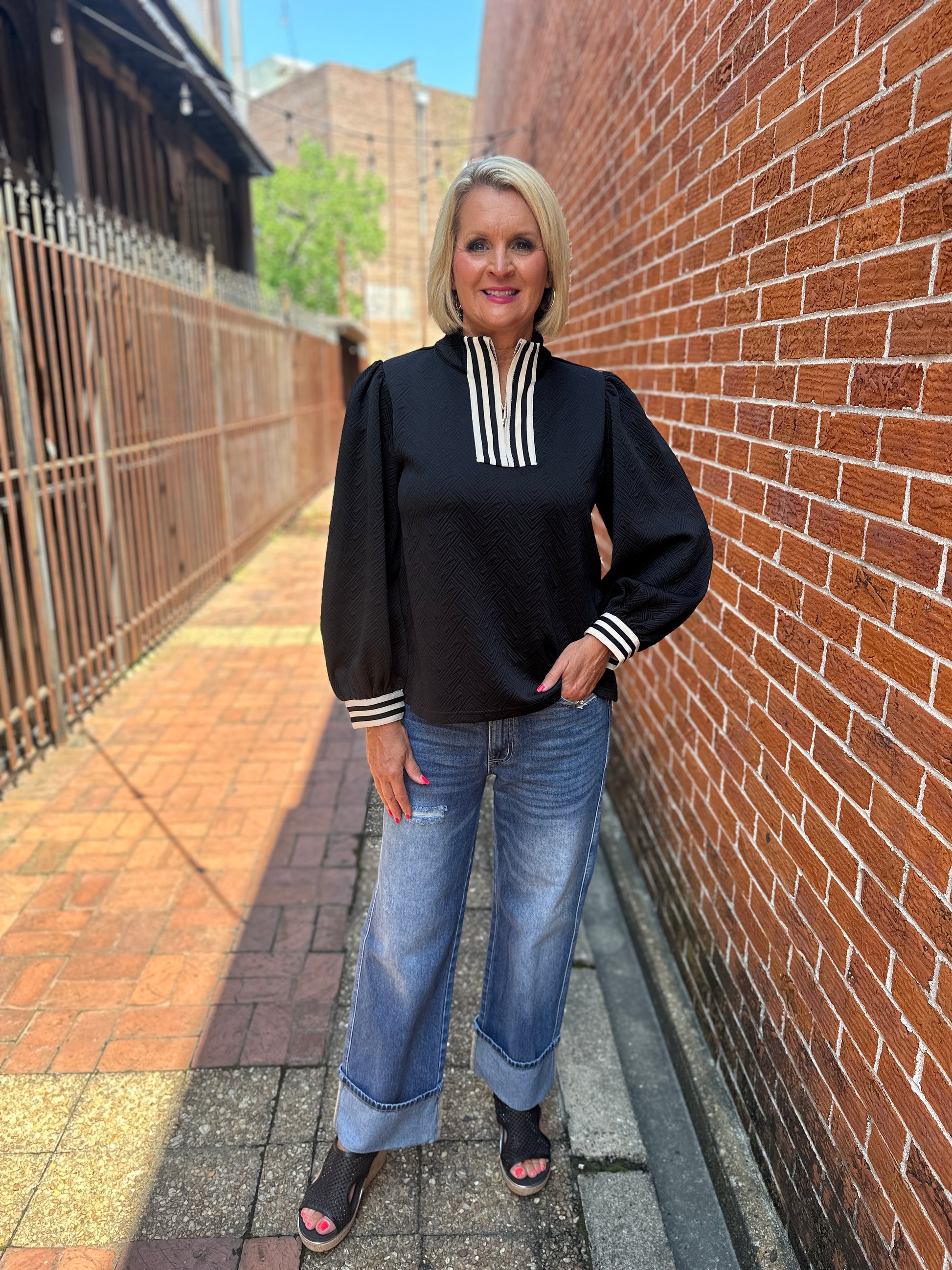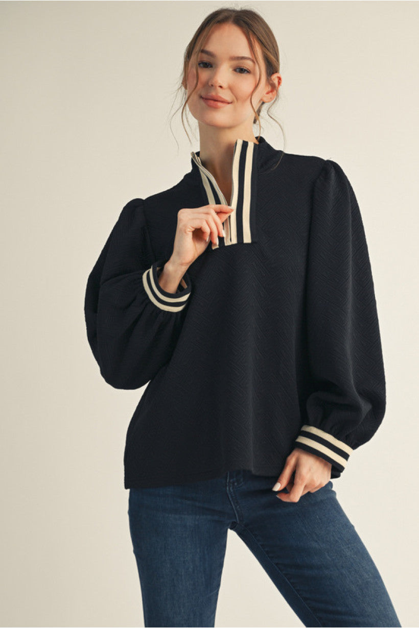 Long puff sleeves textured fabric solid top with front zip up, stripe contrast detail, mock neck.