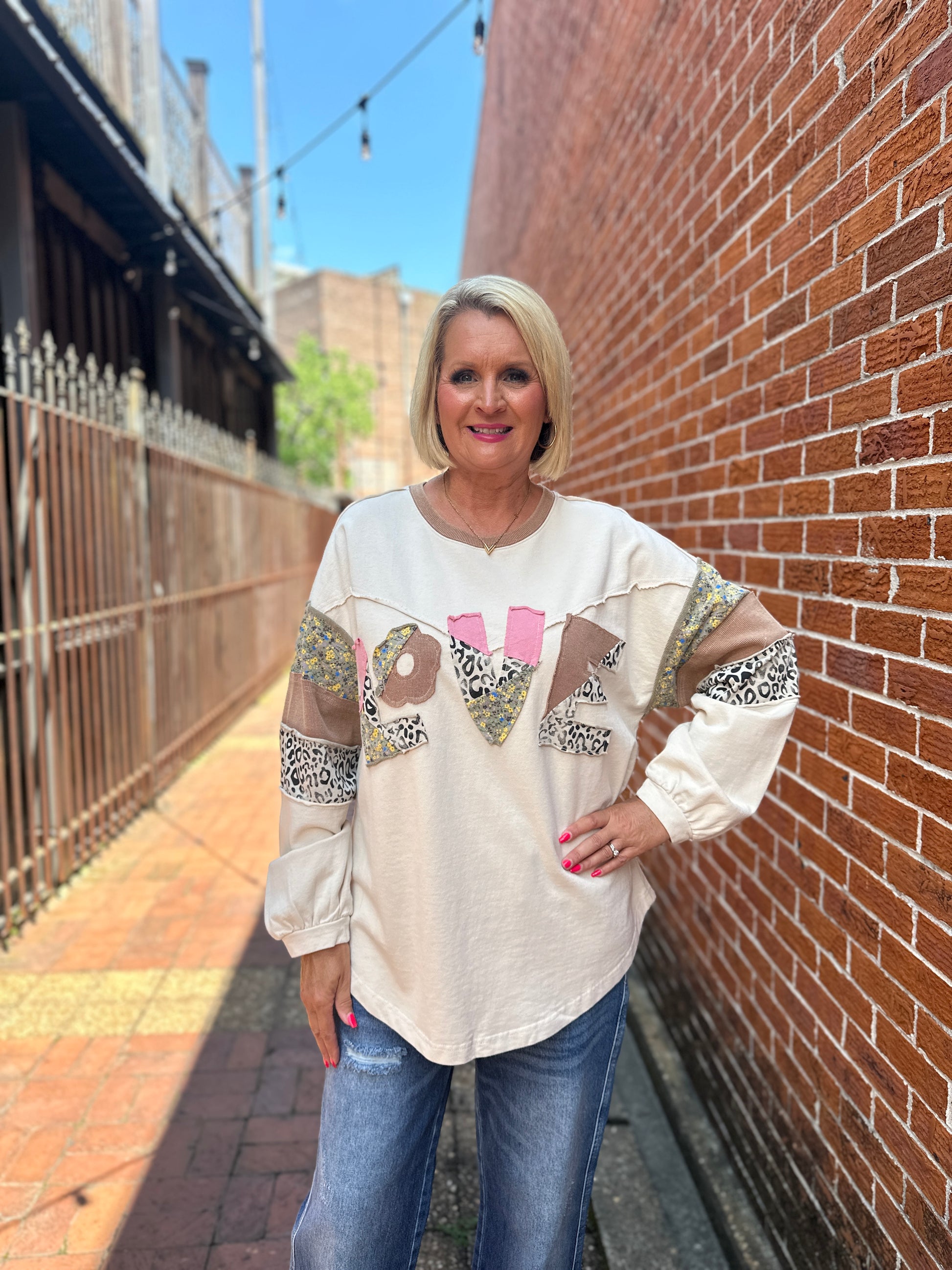 LOVE PATCH FRONT WASHED PULLOVER -MINERAL WASHED -CREW NECKLINE -OVERSIZED FIT -DROPPED SHOULDERS -EACH LETTER DESIGNED WITH DIFFERENT FABRICS -LEOPARD / FLORAL / CORDUROY TEXTURE