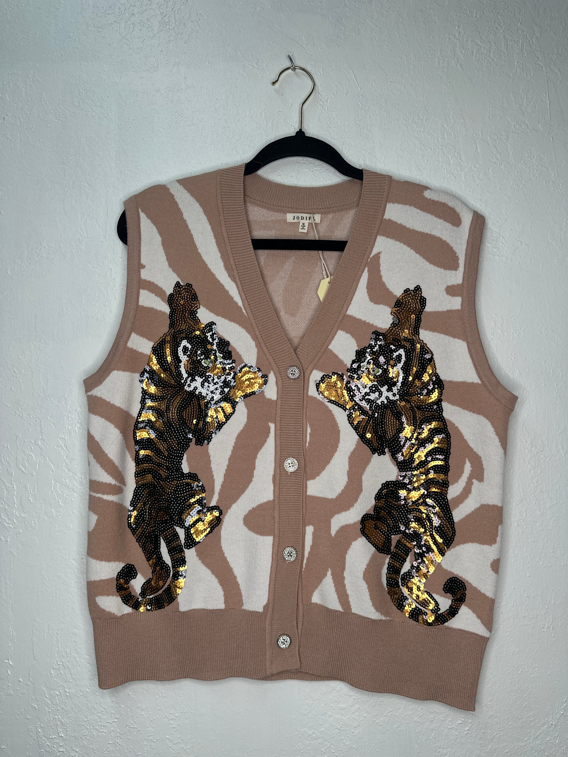 Sleeveless leopard pattern sweater vest with sequins Tiger detail, button down