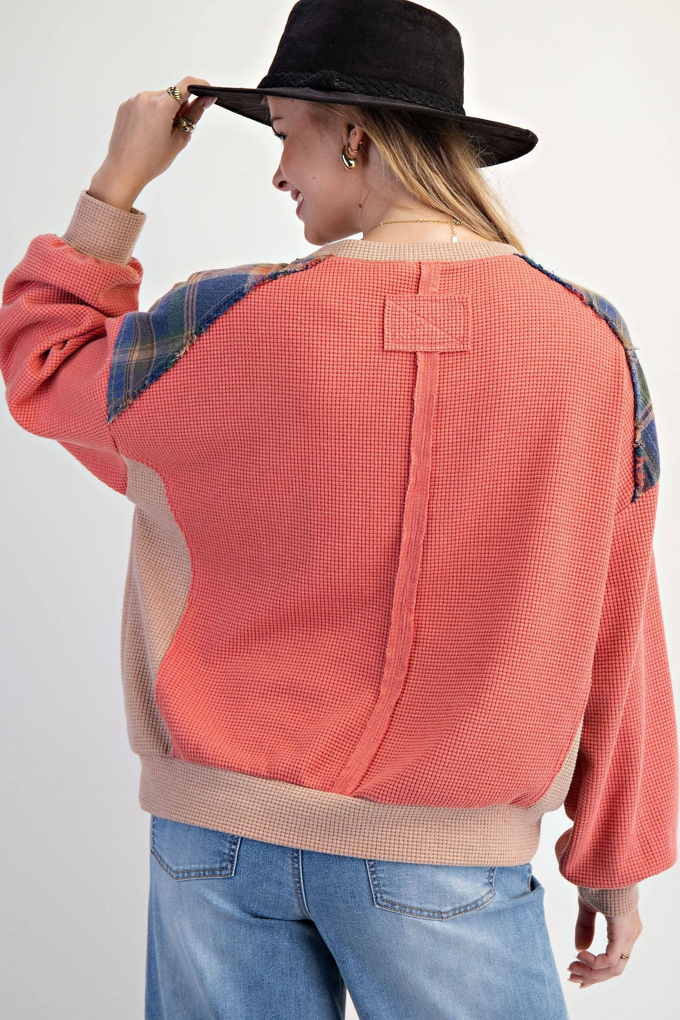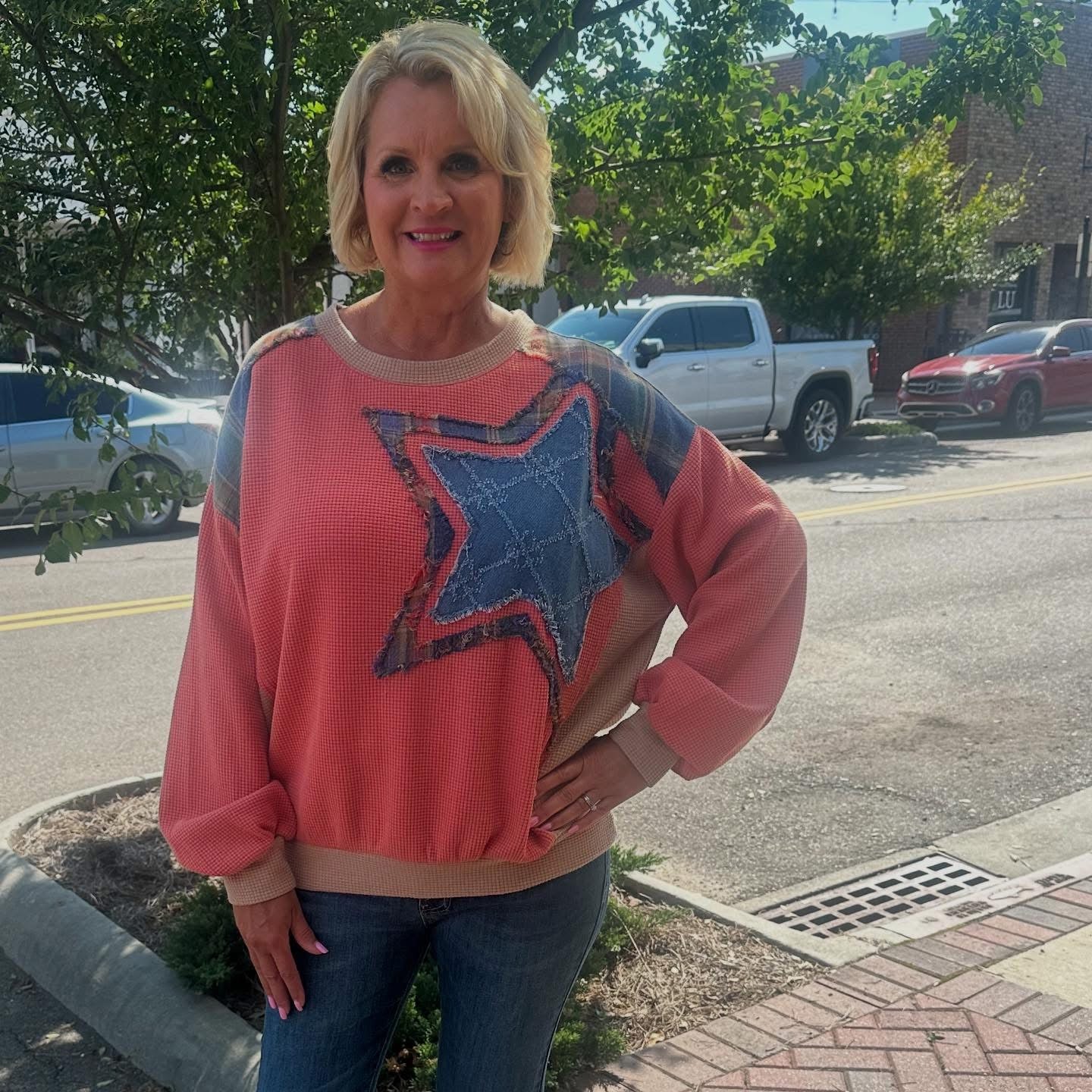 -MINERAL WASHED -RELAXED FIT -WAFFLE TEXTURE FABRIC -LARGE DISTRESSED PATCH STAR DESIGN -DENIM AND PLAID FABRIC CONTRAST -DROP SHOULDER -CREW NECKLINE -SQUARE PATCH AT THE BACK