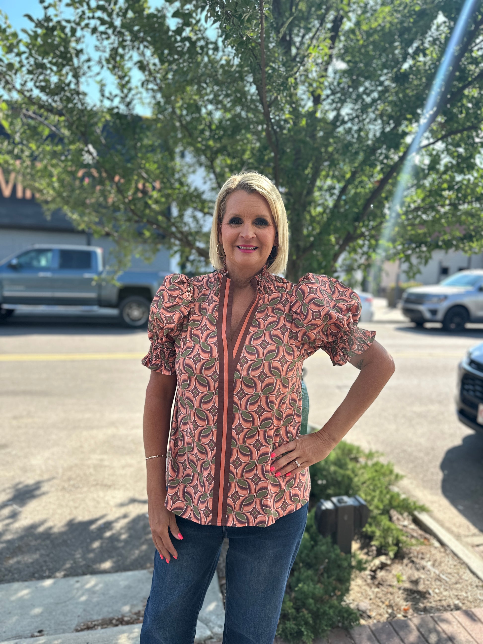 Astract pattern smocked cuff band short puff sleeve top featuring multicolor accent V-neck smocked high neck band. Unlined. Woven. Non-sheer. Lightweight.