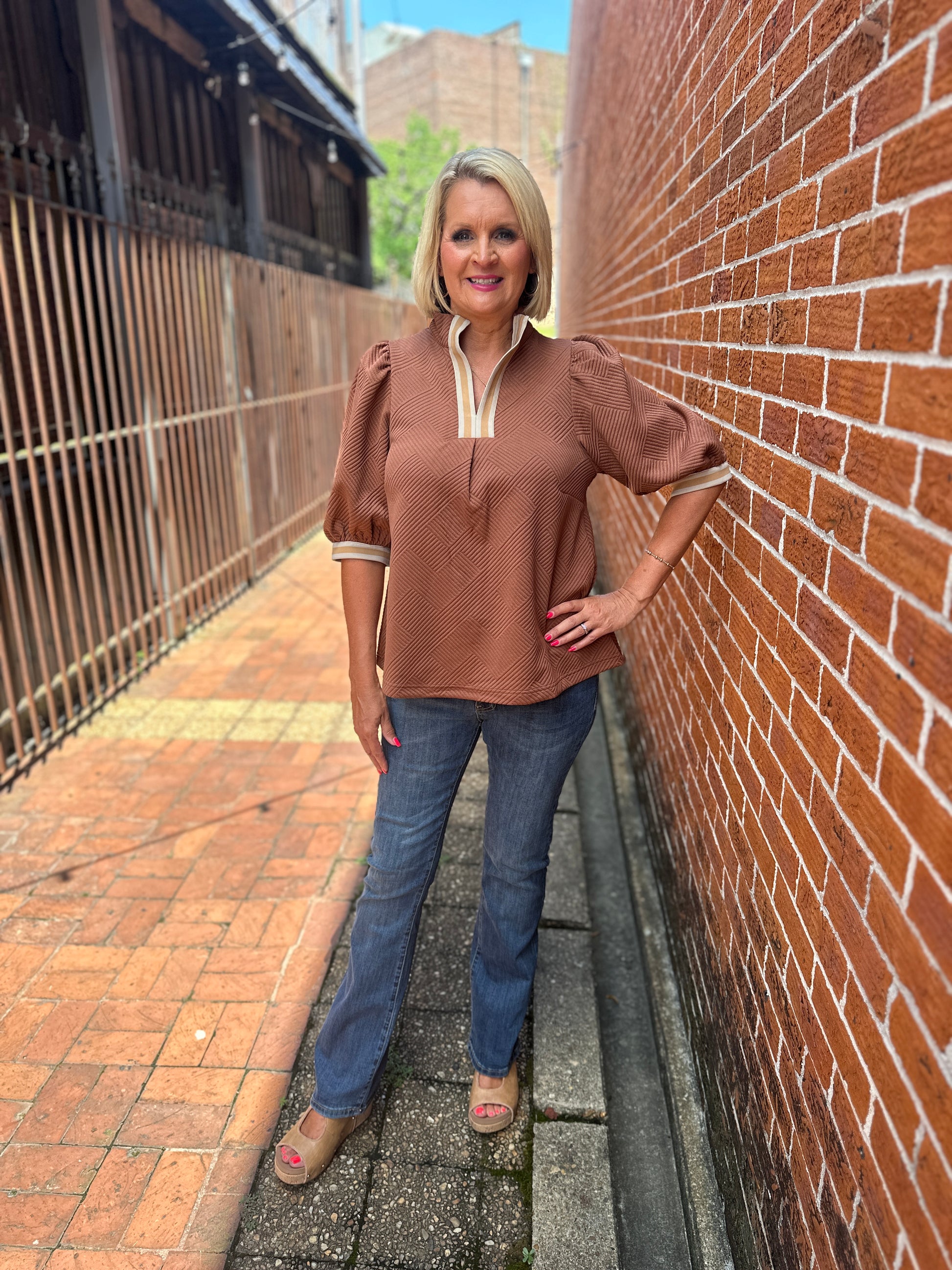 Textured Knit Half-Zip Stripe Trim Top